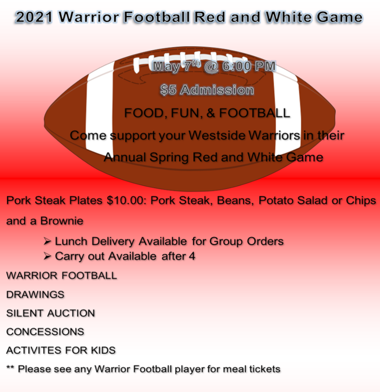 The Annual Warrior Red/White Football Game will be held on May 7th at 6:00 p.m. Please see flyer below for more information.