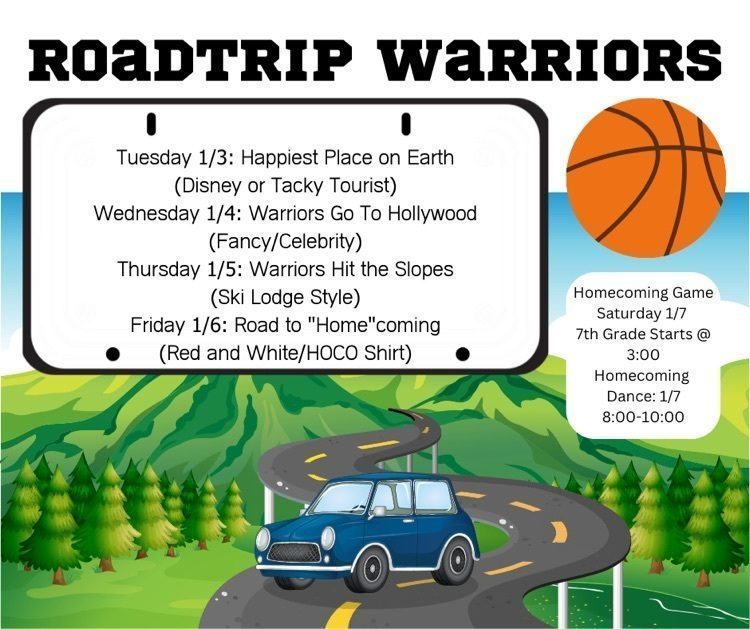 WHS Basketball Homecoming week will begin Tuesday, January 6. The homecoming game and high school dance will be on Saturday, January 7. This weeks theme will be Roadtrip Warriors! Below you will find the daily schedule for the Spirit Days.