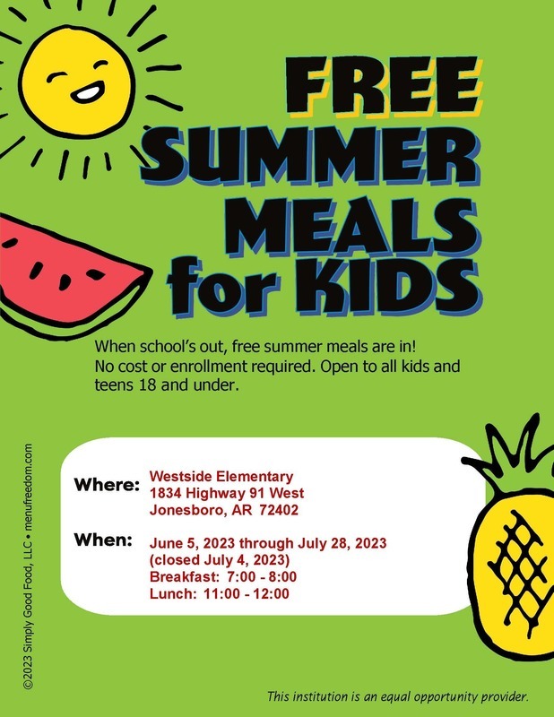 Breakfast and lunch will be served at Westside Elementary beginning June 5th - July 28th. No meals will be served in July 4, 2023. Open to all kids and teens 18 and under. No enrollment necessary.